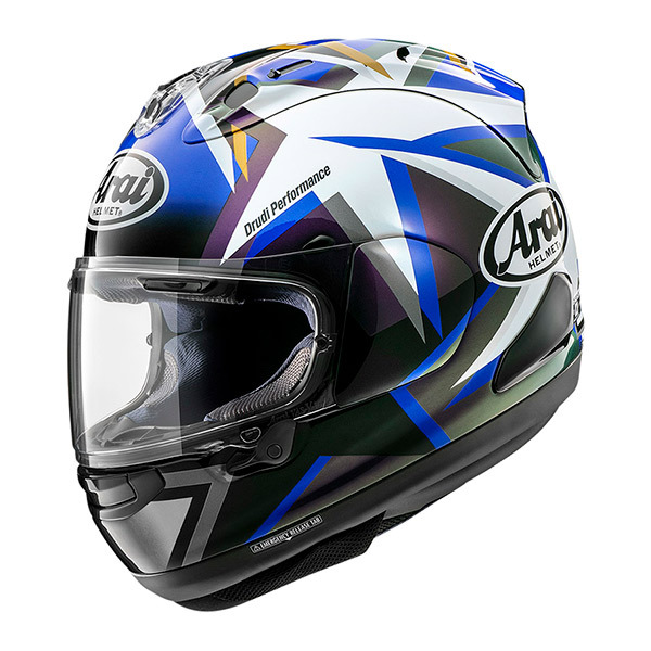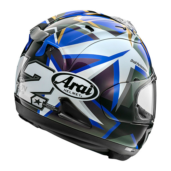 Arai RX-7V Evo Maverick Star Fullface-Rennhelm, handgefertigt mit perfekter Innenpassform. Es enthält eine innovative Z-Mixture-Außenhülle, einen revolutionären VAS-Bildschirm, einen Doppel-D-Verschluss und ist für die Unterbringung eines Kommunikationssystems vorbereitet (nicht im Lieferumfang enthalten).